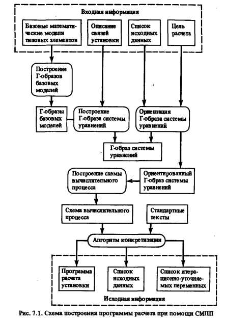 Автоматизация моделирования ТЭЦШирокое внедрение методов математического моделирования в практику инженерных расчетов выявило узкое место этого процесса — большие затраты труда высококвалифицированных инженеров и программистов на разработку программ расчета. В большинстве случаев эти затраты связаны с тем, что незначительные изменения в математических описаниях моделируемых объектов требуют перепрограммирования по сути дела одних и тех же алгоритмов. Кроме того, в алгоритмах, разработанных ручным способом, последовательность расчета определяется на основании субъективных соображений инженеров и программистов, без достаточно глубокого топологического анализа схемы рассматриваемой установки. В результате разработка адекватной математической модели недопустимо затягивается. Решение этой очень важной и сложной задачи по автоматизации высококвалифицированного инженерного и программистского труда многие авторы видят в разработке автоматизированных систем построения математических моделей исследуемых объектов. В данном разделе дается описание одной из таких систем — системы машинного построения программ (СМПП) инженерных расчетов энергетических установок [25, 57]. СМПП является весьма универсальной и может использоваться для построения математических моделей различных энергетических объектов. Наибольшее практическое применение СМПП нашла при построении математических моделей ТЭЦ. Объясняется это тем, что ТЭЦ имеет наиболее сложные среди энергетических установок технологические тепловые схемы и применение СМПП дает в этом случае наибольший эффект. Описание СМПП. При создании СМПП стремились удовлетворить следующим требованиям: 1) система применима для моделирования любых энергоустановок; 2) при рассмотрении различных вариантов энергоустановки не должно требоваться программистской работы по изменению отдельных блоков системы; 3) исходная информация об энергоустановке должна быть лаконичной и должна задаваться на языке, легко усваиваемом инженерами; 4) продукцией системы должны быть программы на одном из языков высокого уровня, таких, как АЛГОЛ, ФОРТРАН; 5) программы расчета энергоустановок, полученные при помощи системы, должны легко сочленяться с другими программами, в частности с программами оптимизации параметров моделируемых установок. В основе автоматизированного построения при помощи СМПП математических моделей и программ расчета энергетических установок лежат следующие общие соображения. Задавая описания элементов энергоустановок в виде совокупностей отношений (например, уравнений), не обязательно ориентированных на вычисление каких-либо переменных, можно поставить задачу: на основании информации об элементном составе и связях схемы установки автоматически получить ее математическую модель в виде системы отношения; используя такую модель, построить ряд программ расчета с различными целями. Информация о цели расчета при этом может быть задана, вообще говоря, двумя способами: либо указанием того, какие переменные должны быть вычислены, либо заданием списка переменных-исходных данных. Далее встает вопрос о решении полученной системы уравнений. Специфика систем отношений, описывающих энергетические установки, в большинстве случаев позволяет использовать для этой цели разл