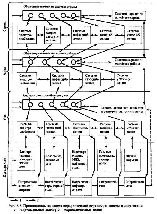 Централизованное теплоснабжение как объект системных исследованийЭнергетика охватывает сложную совокупность процессов преобразования и передачи энергии от источников получения природных энергетических ресурсов до приемников энергии включительно. Она представляет собой сложный развивающийся объект, исследования которого возможны только на основе системного подхода. Ныне энергетику принято рассматривать как Единую государственную обще-энергетическую систему. Эта система как иерархически наивысшая в энергетике объединяет сложнейшую совокупность процессов, охватывающих основные элементы и связи энергетического хозяйства страны. Обоснованное определение основных оптимальных пропорций и направлений развития энергетики страны и ее районов возможно только в рамках Единой обще-энергетической системы. Однако Единая обще-энергетическая система столь велика, что исследователь не может охватить все ее элементы и связи, а поэтому и их одновременно охарактеризовать. Любое описание Единой общеэнергетической системы неизбежно является укрупненным. В этих условиях продуктивным является членение целого — Единой общеэнергетической системы - на квазинезависимые подсистемы. Отдельные подсистемы являются более обозримыми, и в них можно существенно подробнее рассмотреть ряд элементов и связей. К числу таких подсистем относятся и СЦТ. ![]() В основе формирования иерархической структуры систем энергетики находятся производственный и территориальный признаки. В едином энергетическом хозяйстве страны наряду с отраслевыми вертикальными связями, применительно к которым в настоящее время строится хозяйственное управление, существуют и сильные территориальные (горизонтальные) связи. Шесть главных систем энергетики (межотраслевая — обще-энергетическая и входящие в нее функциональные — электроэнергетическая, ядерно-энергетическая, нефте-, газо- и углеснабжения) подразделяются территориально по основным уровням (страна — районы — узлы энергоснабжения — предприятия), создавая единую совокупность иерархически построенных, расположенных на равных и разных иерархических уровнях, но относительно автономно функционирующих систем (рис. 2.2). Каждая из указанных систем страны (кроме ядерно-энергетической) образует соответствующие районные подсистемы. Виды продукции, производимой функциональными системами, широко взаимозаменяемы и тесно переплетаются в отдельных районах и энергетических узлах в зависимости от условий производства, транспорта энергоносителей и расположения потребителей. Поэтому совокупность районных функциональных систем создает автономные районные обще-энергетические системы горизонтального типа. Но любой энергетический район состоит из отдельных узлов энергоснабжения. Ими могут быть: промышленный центр, относительно крупный город, развитый сельскохозяйственный район. Совокупность энергетических установок и транспортно-энергетических связей этих узлов и центров энергоснабжения также образует специфические локальные системы энергоснабжения, конечными элементами которых в данном случае приняты отдельные потребители энергии [9]. Под системами теплоснабжения на рис. 2.2 понимаются как системы, обеспечивающие питание потребителей паром и горячей водой от электростанций, так и системы, получ
