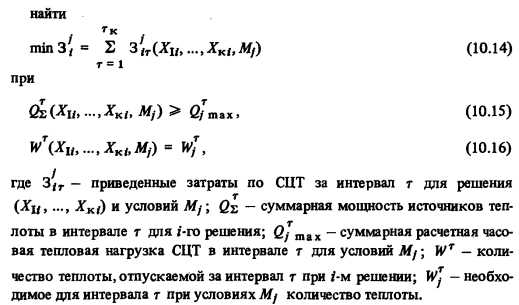 Оптимизация развитая систем теплоснабженияДинамический характер задачи оптимизации развития СЦТ предопределяет необходимость получения решения, взаимоувязанного по всем интервалам рассматриваемого расчетного периода. Основной конечной целью решения оптимизационных динамических задач является нахождение наилучшей последовательности ввода в эксплуатацию и вывода из нее основных объектов рассматриваемой системы. Эта весьма сложная задача нелинейного программирования с дискретными переменными (см. гл. 8) еще больше усложняется при ее решении в условиях неполноты информации. Большое значение для повышения достоверности исходной информации имеет использование принципа обоснования и принятия решений с минимально допустимой заблаговременностью. Этот принцип вытекает из свойства информации постепенно уточняться по мере приближения конкретного календарного срока, к которому она относится. Поэтому в случаях, когда имеется неопределенность выбора, окончательное решение следует принимать возможно позже, непосредственно перед началом его реализации. При этом будет использоваться каждый раз наиболее достоверная информация, имеющая минимально возможную неопределенность. Практическое осуществление принципа минимальной заблаговременности требует соответствующей организации управления принятием решения. Так, при разработке и проектировании непрерывно развивающихся систем окончательное решение должно приниматься только по первоочередным объектам или для ближайшего интервала времени. По следующим объектам или интервалам времени окончательные решения следует принимать позднее, когда лучше прояснится реальная обстановка. При этом проектирование СЦТ будет представлять собой непрерывный процесс последовательного обоснования назревших первоочередных решений. Кроме того, целесообразно разбивать принятие решений на. этапы. Например, раздельно принимать решения о начале проектирования и о начале строительства объектов с параллельным проектированием нескольких конкурирующих объектов. При этом, с одной стороны, в процессе проектирования уточнятся технико-экономические показатели объектов, с другой стороны, за время, необходимое для проектирования, прояснятся внешние условия, что уменьшит неопределенность информации при принятии окончательного решения о строительстве объекта. Осуществление непрерывного проектирования развивающихся систем требует четкого определения последовательности (очередности) принятия и взаимной увязки отдельных решений по развитию их объектов. Надлежащий учет неопределенности информации приводит к тому, что единая задача оптимизации развития СЦТ распадается на ряд задач (подзадач) обоснования отдельных решений, принимаемых в определенной последовательности и с соответствующей заблаговременностью. Каждая такая задача должна быть четко поставлена и увязана с другими задачами по времени (последовательности) решения и по составу обменной информации. В том числе должны быть уяснены связи рассматриваемой задачи с задачами развития систем более высокого иерархического уровня [9,27,91]. Как было отмечено в разд. 10.1, в настоящее время для решения динамических оптимизационных задач в условиях неполноты информации наиболее эффективен метод, базирующийся на использовании матр