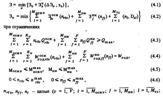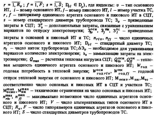 Оптимизация состава оборудования ИТ и диаметров трубопроводов ТС при заданной конфигурации тепловой сетиПри решении задачи оптимизации состава оборудования ИТ и диаметров трубопроводов ТС в статической постановке при заданной конфигурации ТС считаются известными: типоразмеры и технико-экономические показатели генерирующего и сетевого оборудования; вид и стоимостные показатели топлива; замыкающие затраты на электроэнергию. Тепловые нагрузки рассматриваются только в виде горячей воды. Для удобства решения задачи оптимизации структуры СЦТ, как было отмечено в разд. 4.1, была осуществлена ее декомпозиция на ряд задач по альтернативным типам основных ИТ. Таким образом, происходит решение задачи выбора состава оборудования и оптимизации диаметров трубопроводов ТС для каждого типа основного ИТ отдельно, затем сопоставление оптимальных решений, полученных в этих задачах, и выбор оптимального решения общей задачи. При таком подходе математическая постановка задачи оптимизации состава оборудования и диаметров трубопроводов ТС будет следующей: найти минимум приведенных затрат в СЦТ ![]() ![]() В ограничении (4.3) выражено требование к суммарной мощности основных и пиковых ИТ: она должна быть не меньше заданного расчетного значения тепловой нагрузки СЦТ. Ограничение (4.4) означает баланс между годовым отпуском тепловой энергии от основного и пиковых ИТ и годовой потребностью в тепловой энергии СЦТ. Выражения (4.5) и (4.6) соответствуют ограничениям на число основных и пиковых ИТ в СЦТ и количество единичных агрегатов в ИТ. Для решения поставленной задачи создана математическая модель СЦТ, представляющая собой описание количественных и качественных взаимосвязей между основными и пиковыми ИТ и ТС. Необходимый отпуск тепловой энергии определяется по аналитическим зависимостям, описывающим график Россандера (график тепловых нагрузок по продолжительности). В качестве одного из основных параметров математической модели СЦТ принят показатель доли участия основного ИТ в покрытии расчетной тепловой нагрузки СЦТ, который определяет соотношение мощностей основного и пиковых ИТ, а в конечном итоге и выработки тепловой энергии этими ИТ. Выработка электроэнергии суммарная и на тепловом потреблении, а также расход теплоты на турбины ТЭЦ и АТЭЦ рассчитываются по упрощенным энергетическим характеристикам в зависимости от изменения давления пара в регулируемом отборе. Приведение вариантов структуры СЦТ к одинаковому энергетическому эффекту осуществляется с помощью замыкающих затрат на электроэнергию. Для расчета экономических характеристик вариантов структуры СЦТ используются укрупненные показатели (удельные капвложения, доля амортизации, замыкающие затраты на топливо и т.п.). Ограниченное число типоразмеров оборудования основных и пиковых ИТ, а также стандартных диаметров трубопроводов ТС лри заданной ее конфигурации приводит к сравнительно небольшому числу возможных вариантов состава оборудования и диаметров трубопроводов ТС, что позволяет в качестве метода решения поставленной оптимизационной задачи (4.1) — (4.6) использовать метод полного перебора вариантов. Алгоритм решения задачи поиска оптимального варианта состава оборудования ИТ и диаметров трубопроводов ТС в статической постановке при заданной конфигурации Т
