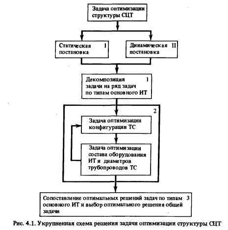 Постановка задачиПри разработке схем теплоснабжения городов или промышленных центров на перспективу 10—15 лет задача оптимизации структуры СЦТ является основной и включает выбор структуры, единичной мощности и состава основного оборудования; конфигурации и параметров транзитных и магистральных тепловых сетей; очередности ввода оборудования. Наиболее общая постановка задачи оптимизации СЦТ предполагает рассмотрение ее как динамической, т.е. с учетом роста тепловых нагрузок по годам расчетного периода. Кроме того, для многих СЦТ, перспективы развития которых исследуются, необходим учет существующей части системы. Попытка решения такой задачи в рамках одной математической модели, которая учитывала бы сложнейший комплекс связей, реально существующих в СЦТ, привела бы к трудностям, связанным с необходимостью решения задачи исключительно большой размерности. Опыт разработки глобальных математических моделей оптимизации СЦТ в ряде организаций [6, 15, 30—33] подтверждает наличие больших трудностей при их создании, а главное, при использовании в проектной практике. В настоящее время представляется целесообразным решать задачу оптимизации структуры СЦТ с помощью комплекса взаимосвязанных математических моделей, предназначенных для решения отдельных задач (рис. 4.1). По способу учета тепловой нагрузки постановку задачи оптимизации структуры СЦТ можно разделить на статическую (блок I) и динамическую (блок П). При статической постановке задачи расчетная тепловая нагрузка СЦТ задается на конечный уровень развития СЦТ; при динамической — по годам расчетного периода. Общий алгоритм поиска наилучшего решения как статической, так и динамической задачи оптимизации структуры СЦТ может быть представлен как итерационный процесс, состоящий из трех этапов: декомпозиции исходной задачи на ряд задач по числу альтернативных типов основных ИТ (блок 1), далее решения каждой задачи отдельно (блок 2) с последующим сопоставлением оптимальных решений, полученных в задачах, и выбора оптимального решения задачи оптимизации структуры СЦТ (блок 3). Второй этап — решение отдельных задач (блок 2) — целесообразно разделить на две части: задачу оптимизации конфигурации ТС и задачу оптимизации состава оборудования ИТ и диаметров трубопроводов ТС. В результате решения первой задачи определяются оптимальные трассировки транзитной и магистральной ТС, места расположения и мощности ИТ; при этом используются укрупненные технико-экономические показатели ИТ. Результаты, полученные в первой задаче, служат исходной информацией для второй задачи, при решении которой используются технико-экономические показатели ИТ с учетом состава их оборудования, а для ТС — диаметров трубопроводов. В результате решения второй задачи определяются оптимальные составы оборудования ИТ и диаметры трубопроводов ТС. ![]() В том случае, если технико-экономические показатели ИТ, полученные при решении второй задачи, отличаются от соответствующих укрупненных показателей первой задачи более чем на заданную величину, решение итеративно уточняется при скорректированных показателях ИТ и ТС. Методы решения названных задач и соответствующие математические модели представлены для статической постановки в настоящей главе в разд. 4.2 и 4.3, для динамической постановки — в гл. 8. На тр