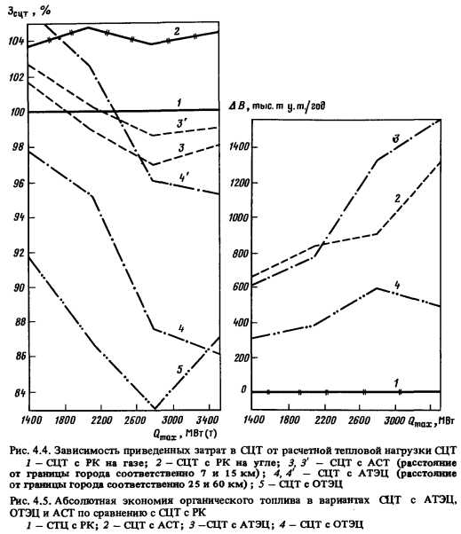 Пример использования программно-вычислительного комплекса для исследования СЦТПрограммно-вычислительный комплекс, описанный в разд. 2.2, позволяет проводить исследование СЦТ с различными типами основного ИТ, в том числе определить оптимальные структуру СЦТ и состав оборудования основных и пиковых ИТ, исследовать влияние неоднозначности исходных данных, таких, как технико-экономические показатели ИТ и ТС, вид и замыкающие затраты на органическое топливо и т.д. [37, 38]. В качестве иллюстрации возможностей ПВК ниже представлены некоторые результаты исследований по определению сравнительной экономической эффективности ИТ различных типов. Расчеты выполнялись при следующих условиях и допущениях: в качестве конкурирующих приняты четыре типа основных ИТ: РК, ACT, АТЭЦ и ОТЭЦ; при этом количество основных ИТ принято равным 1 для вариантов СЦТ с ACT, АТЭЦ и ОТЭЦ и от 3 до 10 — для СЦТ с РК в зависимости от тепловой нагрузки города; в СЦТ с ACT, АТЭЦ и ОТЭЦ устанавливаются пиковые ИТ; ACT, АТЭЦ, ОТЭЦ и РК на угле располагаются за чертой города, РК на газе - в черте города, пиковые ИТ находятся в центрах тепловых нагрузок районов города, в качестве топлива для них принят газ; конфигурация тепловой сети от ACT, АТЭЦ и ОТЭЦ до пиковых ИТ, а также от РК на угле до центров тепловых нагрузок задана; расстояние от ACT до перспективной границы города равно 7 и 15 км, от АТЭЦ — 25 и 60 км; на ACT устанавливаются реакторы единичной мощностью 500 МВт (т); на АТЭЦ - реакторы ВВЭР-1000 и турбины ТК-450/500-60; на ОТЭЦ - турбины четырех типов: Т-100/110-130, Т-175/210-130, Т-180/210-130, Т-250/300-240; в пиковых и районных котельных - водогрейные котлы единичной мощностью 58,116,209 МВт(т); технико-экономические показатели ИТ и тепловых сетей приняты по укрупненным нормативам в ценах 1984 г.; рассматриваемый район — Центр европейской части СССР; принятый диапазон расчетных тепловых нагрузок - 1400—3700 МВт(т); доля нагрузки горячего водоснабжения — 0,2; замыкающие затраты на газ — 57 руб/т у.т. и на уголь — 48 руб./т у.т. В результате проведенных расчетов были определены зоны расчетных тепловых нагрузок СЦТ, где экономически целесообразно применение того или иного типа основного ИТ. На рис. 4.4 представлены зависимости приведенных затрат в СЦТ от расчетной тепловой нагрузки СЦТ. Приведенные затраты в СЦТ с РК на угле, ОТЭЦ, АТЭЦ и ACT даются в процентах по отношению к приведенным затратам в СЦТ с РК на газе. Наличие точек изломов на графиках обусловлено дискретностью типоразмеров оборудования, устанавливаемого на основных и пиковых ИТ. Расчеты показывают, что при принятых исходных данных наиболее экономичным вариантом является вариант структуры СЦТ с ТЭЦ на органическом топливе, наименее экономичным — структуры СЦТ с РК на угле. Варианты СЦТ с атомными ИТ занимают промежуточное положение. Следует отметить, что с ростом расчетных тепловых нагрузок сравнительная экономическая эффективность СЦТ с атомными ИТ повышается. В данном сопоставлении рассматривался базисный режим работы ТЭЦ на органическом топливе. При переводе ОТЭЦ в полупиковый режим их преимущества существенно уменьшатся. ![]() На рис. 4.4 проиллюстрировано также влияние расстояния от атомных ИТ до границы города на их экономическую эффективность. Так, увеличение расстояния от АТЭЦ с 25 до 60 км и от ACT с 7 до 15 км приводит к росту приведенных затрат в варианте СЦТ с АТ