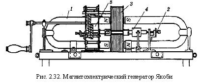На рис. 2.31 представлен усовершенствованный вариант генератора Р.М. Однако переменный ток в то время не мог еще найти себе потребителя, так как для всех практических применений электричества (минная электротехника, электрохимия, только что зародившаяся электромагнитная телеграфия, первые электродвигатели) требовался постоянный ток. Поэтому в последующем изобретатели направили свои усилия на построение генераторов, дающих постоянный элект рический ток, разрабатывая для этих целей разнообразные коммутационные устройства. Впервые приспособление для выпрямления тока в попеременно-полюсной машине (в отличие от униполярной машины М. Фарадея, которая не нуждалась в устройстве для выпрямления тока, так как давала непосредственно постоянный ток) было применено в 1832 г. в генераторе французских изобретателей братьев Пиксии. Изобретение представлялось тогда настолько важным, что сообщения о нем были дважды сделаны в Парижской академии наук. В первых конструкциях генераторов для получения тока неизменного направления (но резко пульсирующего) применялось так называемое коромысло Ампера. А. М. Ампер отмечал пластинчатый барабанный коммутатор в машине Пиксии с прижимающимися к амальгамированным поверхностям пластин подпружиненными медными или бронзовыми пластинами - щетками. Позднее он стал основой коммутирующих устройств для всех последующих конструкций генераторов постоянного тока. С машиной Пиксии работал Э. Х. Ленц, и именно на этой машине в 1838 г. он демонстрировал принцип обратимости. Недостатком машин Р.М. и братьев Пиксии явилось то, что в них приходилось вращать более или менее тяжелые постоянные магниты. Целесообразнее оказалось сделать магниты неподвижными, а заставить вращаться более легкие катушки. При этом проще было выполнить и коммутирующее устройство, вращающаяся часть которого была закреплена на валу вместе с якорем. Магнитоэлектрические генераторы такого типа оказались значительно удобнее и именно в такой конструктивной форме впервые вошли в практику. Первым генератором, получившим практическое применение, был, как уже отмечалось, магнитоэлектрический генератор Б. С. Якоби. Занимаясь усовершенствованием методов электрического взрывания мин, Б. С. Якоби построил в 1842 г. генератор, названный им «магнитоэлектрической батареей» (рис. 2.32). При вращении катушек 3 зубчатой передачей 5 в поле постоянных магнитов 1 в них наводилась ЭДС; на валу 2 имелось коммутирующее устройство 4 в виде двух полуцилиндров, представлявшее собой простейший двухпластинчатый коллектор. Этот генератор был принят на вооружение гальванических команд русской армии, использовавших его для воспламенения минных запалов. ![]()