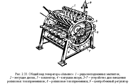 Стремление повысить мощность магнитоэлектрических генераторов привело к увеличению количества постоянных магнитов. Этот путь отражал уже знакомую из истории развития электродвигателей тенденцию: для увеличения мощности соединять несколько элементарных машин в одну. Наибольшее распространение в лабораторной практике 40-50-х гг. XIX в. получил магнитоэлектрический генератор немецкого электротехника Э. Штерера (1813-1890) с тремя вращающимися постоянными магнитами (1843). Этот генератор использовался учеными (в том числе Э. Х. Ленцем и Б. С. Якоби) для исследования процессов в магнитоэлектрических машинах. Известный толчок к построению более мощных магнитоэлектрических генераторов дали дуговые лампы с регуляторами, получившие применение на маяках в связи с развитием морского транспорта. Еще в 1849 г. профессор физики Брюссельской военной школы Жан Антуан Нолле принялся за построение мощного магнитоэлектрического генератора для установки на маяках, избрав уже проторенный путь комбинирования в одном агрегате большого числа машин. Работы Нолле были продолжены другими учеными, и к 1856 г. машина получила свое конструктивное завершение. Для производства таких генераторов в Париже была организована электропромышлен- ная компания «Альянс» (отсюда произошло и название новой машины). Первая такая машина была установлена на маяке близ г. Гавра. В генераторе «Альянс» (рис. 2.33) на чугунной станине были укреплены в несколько рядов подковообразные постоянные магниты, расположенные по окружности и радиально по отношению к валу. В промежутках между рядами магнитов на валу устанавливались диски с большим числом катушек- якорей. В машине было 40 магнитов и 64 стержня (явнополюсных якоря). Различные варианты машины «Альянс» имели разное количество рядов магнитов (три, пять, семь). На валу генератора укреплен коллектор с 16 металлическими пластинами, изолированными друг от друга и от вала машины. В качестве коллекторных щеток служили специальные ролики. В машине впервые было предусмотрено устройство для смещения роликов в зависимости от нагрузки. Перемещение роликов происходило под действием тяг, идущих от центробежного регулятора, который был связан с валом машины. В 1857-1865 гг. в эксплуатации было около 100 машин «Альянс». Для привода одной такой машины требовался паровой двигатель мощностью 610 л. с. Масса шестидисковой машины «Альянс» доходила до 4 т. Есть сведения, что машина «Альянс» получила одобрение М. Фарадея. Генератор «Альянс» нагляднее, чем другие, меньшие по размерам машины, показал недостатки, присущие вообще магнитоэлектрическим машинам. Материалы и технология производства постоянных магнитов были еще несовершенными. Под действием реакции якоря, в результате естественного старения и возможных вибраций магниты быстро размагничивались, в связи с чем ЭДС генератора уменьшалась и его мощность снижалась. Во всех этих машинах применялись стержневые якоря, имевшие многослойную обмотку. При работе они быстро нагревались вследствие плохого отвода теплоты, что приводило к разрушению изоляции. Масса и габариты магнитоэлектрических генераторов, несмотря на их небольшую мощность, были весьма значительными, и крупные машины были сравнительно дорогими. Принципиальным недостатком машин с явнополюсными якорями явилось то, что они давали резко