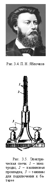 Электрическое освещениеПервым по-настоящему массовым потребителем электрической энергии явилась электрическая лампочка. Она и по нынешний день осталась самым распространенным электротехническим устройством. Начало широкому практическому применению электрической энергии положила в 1876 г. электрическая свеча выдающегося русского изобретателя электротехника Павла Николаевича Яблочкова (1847-1894) (рис. 3.4), занимающая особое место среди дуговых источников света [5, 9, 21, 22]. Хотя изобретение электрической свечи не привело к массовому и устойчивому применению именно этого источника света, оно заслуживает особой оценки и отдельного рассказа, поскольку послужило мощным импульсом к бурному росту электротехнической промышленности. На рис. 3.5 показан внешний вид электрической свечи, где видно, что в держателе с токопроводами укреплялись два параллельных угольных стержня, отделенных один от другого слоем каолина. В верхней части лампы была тонкая проводящая перемычка-запал: когда включали лампу, перемычка сгорала, на ее месте возникала дуга и угли выгорали, уменьшаясь в размерах, как стеариновая свеча. Одна электрическая свеча могла гореть около 2 ч; при установке нескольких свечей в специальном фонаре, оборудованном переключателем для включения очередной свечи вместо перегоревшей, можно было обеспечить бесперебойное освещение в течение более длительного времени.