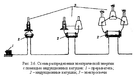 Чрезвычайно важно отметить, что изобретение электрической свечи способствовало внедрению в практику переменного тока. В течение всего предшествующего периода электрическая техника базировалась на постоянном токе (телеграфия, гальванотехника, минное дело). Дуговые электрические лампы с регуляторами также питались постоянным током. При этом положительный электрод сгорал быстрее отрицательного, поэтому его приходилось брать большего диаметра. П. Н. Яблочков установил, что для питания свечи лучше применять переменный ток, в этом случае при электродах одинакового диаметра получалась вполне устойчивая дуга. В связи с тем что осветительные установки по системе П. Н. Яблочкова стали подключать к источникам переменного тока, заметно возрос спрос на генераторы переменного тока, которые раньше не находили практического применения. О значении электрической свечи в расширении производства электрических генераторов переменного тока можно судить по следующему примеру: если до появления электрической свечи завод З.Т. Грамма выпускал в течение 1870-1875 гг. по нескольку десятков машин в год, то за 1876 г. выпуск генераторов возрос почти до 1000 шт. Заводы изготовляли электрические генераторы, специально предназначенные для установок электрического освещения, и даже мощность машин обозначалась по числу питаемых электрических свечей (например, «шестисвечная машина»). Значительному развитию электротехники способствовала также разработка П. Н. Яблочковым весьма эффективных систем «дробления электрической энергии», обеспечивавших возможность включения в цепь, питаемую одним генератором, нескольких дуговых ламп. Среди способов «дробления», предложенных П. Н. Яблочковым, два получили практическое применение: секционирование обмотки якоря генератора (в результате получалось несколько независимых цепей, в которые включались свечи) и использование индукционных катушек (рис. 3.6). Первичные обмотки катушек включались последовательно в цепь, а ко вторичной обмотке в зависимости от ее параметров могли подключаться одна, две свечи и более. Если первичная цепь питалась постоянным током, то предусматривалось включение в нее специального прерывателя для наведения ЭДС во вторичных обмотках катушек.