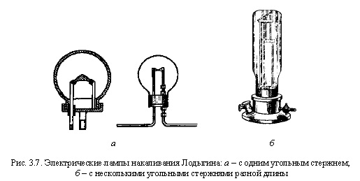 На рис. 3.6 видно, что П. Н. Яблочков впервые использует индукционную катушку в качестве трансформатора. Схема интересна и тем, что в ней впервые получила свое оформление электрическая сеть с ее основными элементами: первичный двигатель - генератор - линия передачи - трансформатор - приемник. Но значение электрической свечи этим не исчерпывается. Изобретение дешевого приемника электрической энергии, доступного для широкого потребителя, потребовало решения еще одной важнейшей электротехнической проблемы - централизации производства электрической энергии и ее распределения. П. Н. Яблочков первым указал на то, что электрическая энергия должна вырабатываться на «электрических заводах» и распределяться подобно тому, как доставляются к потребителям газ и вода. Дальнейший прогресс электрического освещения был связан с изобретением лампы накаливания, которая оказалась более удобным источником света, имеющим лучшие экономические и световые показатели. В 1870-1875 гг. над созданием лампы накаливания работал русский отставной офицер Александр Николаевич Лодыгин (1847-1923) [23]. Он решил построить летательный аппарат тяжелее воздуха, приводящийся в движение электричеством («электролет») [5, 23, 24]. Вполне естественно, что освещаться этот аппарат должен был электричеством. Дуговая лампа по разным соображениям не подошла, и А. Н. Лодыгин стал конструировать лампу накаливания с тонким угольным стерженьком, заключенным в стеклянном баллоне (рис. 3.7). Стремясь увеличить время горения, А. Н. Лодыгин предложил устанавливать несколько угольных стерженьков, расположенных так, чтобы при сгорании одного автоматически загорался следующий. Первая публичная демонстрация ламп А. Н. Лодыгина состоялась в 1870 г., а в 1874 г. он получил «русскую привилегию» (авторское свидетельство) на свою лампу. Затем он запатентовал свое изобретение в нескольких странах Западной Европы. Постепенно он усовершенствовал лампы. Первые лампы работали 30-40 мин, но когда он применил вакуумные колбы, срок службы ламп увеличился до нескольких сотен часов. Больше всего известности, почестей и славы за электрическую лампу был удостоен Томас Алва Эдисон. Но Эдисон не изобрел лампу. Он сделал другое: разработал во всех деталях систему электрического освещения и систему централизованного электроснабжения [5, 9, 25]. В 1879 г. Т. А. Эдисон заинтересовался проблемой электрического освещения. К этому времени он был уже известен как талантливый телеграфист и изобретатель автоматического счетчика голосов, автор усовершенствований в области многократной телеграфии и телефонного аппарата Белла, изобретатель фонографа. Есть достаточно убедительные сведения о том, что Т. А. Эдисон хорошо знал изобретения своих предшественников в области электрического освещения посредством ламп накаливания, в том числе работы А. Н. Лодыгина. Он находился также под впечатлением работ П. Н. Яблочкова. Впрочем, сам Т. А. Эдисон любил повторять, что всегда, когда он хотел сделать что-то новое, он тщательно изучал все, что было сделано по данному предмету до него.