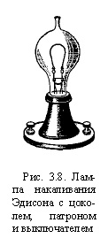 Эдисон сразу поставил перед собой две задачи: 1) лампа должна создавать умеренную освещенность; 2) каждая лампа должна гореть совершенно независимо от других. Так он пришел к выводу о необходимости иметь нить высокого сопротивления, что позволит включать лампы параллельно (а не последовательно, как до этого поступали с любыми электрическими лампами). 12 апреля 1879 г. Т. А. Эдисон получил первый патент на лампу с платиновой спиралью высокого сопротивления, а в январе 1880 г. - на лампу с угольными нитями. Он разработал систему откачки баллонов, технологию крепления вводов и угольной нити и в январе 1880 г. устроил публичную демонстрацию ламп в Менло-Парке - научном центре близ Нью-Йорка. Для того чтобы система освещения стала коммерческой, Т. А. Эдисон должен был придумать множество устройств и элементов: цоколь и патрон (рис. 3.8), поворотный выключатель, плавкие предохранители, изолированные провода, крепящиеся на роликах, счетчик электрической энергии. В 1881 г. на Первой Всемирной выставке в Париже лампы Т. А. Эдисона вызвали всеобщий восторг, а сам изобретатель был удостоен высшей награды. В 1882 г. Т. А. Эдисон построил в Нью-Йорке на Пирльстрит первую центральную электростанцию.