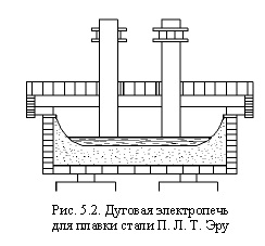 В 1899 г. П. Л. Т. Эру построил промышленную печь прямого нагрева для плавки стали (рис. 5.2), а Э. Стассано (Италия) - шахтную электрическую домну для выплавки чугуна из руд, представляющую собой печь косвенного нагрева с вращением наклонной ванны (рис. 5.3). Дуговые сталеплавильные печи прямого нагрева. В 1900-1915 гг. были выполнены различные усовершенствования печей конструкции П. Л. Т. Эру и Э. Стассано: печь с тремя электродами, трехфазное питание, подовый электрод, съемный свод, неподвижная ванна, графитизированные электроды, свинчиваемые (наращиваемые) электроды и т. д., которые способствовали распространению дуговых сталеплавильных печей (ДСП) в металлургии [33]. Использование дуговых печей в России началось с 1910 г., когда на Обуховском заводе в Петербурге была установлена двухэлектродная сталеплавильная печь Эру мощностью 500 кВ-А для дуплекс-процесса (мартен - электропечь). Емкость печи составляла 3,5 т при жидкой завалке и 2,5 т при твердой завалке, удельный расход электроэнергии - соответственно 280 и 865 кВт-ч/т. Важными этапами для электрометаллургии России и СССР явились: 1910 г. - пуск завода «Пороги» на р. Сатке (ныне Челябинская область) с печами для получения ферросилиция и углеродистого феррохрома (две печи мощностью по 350 кВт) и производство карбида кальция в печи 250-300 кВт на заводе в г. Алаверди (Армения); 1916 г. - разработка (С. И. Тельный и В. Г. Евреинов) печи для плавки стали с вращающейся дугой; 1917 г. - начало строительства электросталеплавильного завода «Электросталь» под г. Богородском (ныне г. Ногинск Московской области) с установкой четырех печей П. Л. Т. Эру емкостью 1,5 т; 1925 г. - выпуск двух печей с вращающейся дугой емкостью по 0,25 т и мощностью 200 кВ-А для фасонного литья на заводе «Электросила» (позднее Харьковском электромашиностроительном заводе - Л. И. Аронов и А. П. Ионов); 1928 г. - на Московском электрозаводе сконструирована и изготовлена дуговая печь ГЭТ косвенного действия для плавки меди (четыре типоразмера печи мощностью 100-325 кВ-А и емкостью 100-1200 кг); 1931 г. - изготовление и пуск в эксплуатацию трехтонных дуговых сталеплавильных печей (ДСП); 1932 г. - изготовление десятитонной ДСП и первых ферросплавных печей мощностью 800 и 1600 кВ-А; 1928-1934 гг. - на Московском электрозаводе изготовлена 151 дуговая печь емкостью до 12 т (Л. И. Аронов, К. М. Филиппов и др.); 1940 г. - на заводе «Уралэлектромашина» изготовлена ДСП емкостью 30 т (пущена в г. Запорожье). За годы войны дуговые печи на предприятиях устарели, и появилась необходимость создания новых печей. В 1949-1952 гг. ОКБ треста «Электропечь» разработало серию дуговых сталеплавильных печей с выкатывающейся ванной (ДСВ) емкостью 5, 10, 18 и 30 т. Всего на МосЗЭТО было изготовлено 40 печей общей емкостью свыше 700 т. В 1951-1953 гг. на заводе «Днепроспецсталь» были пущены в эксплуатацию две печи емкостью по 18 т и одна печь емкостью 30 т. В 1955 г. была разработана печь с поворотным сводом емкостью 80 т. Две такие печи были изготовлены в 1958 г. Новосибирским ЗЭТО и установлены на Новолипецком металлургическом комбинате. В 1971 г. на волгоградском металлургическом заводе «Красный Октябрь» были введены в эксплуатацию две печи ДСП-200, разработанные ВНИИЭТО. Емкость такой печи - 200 т, мощность печного трансформатора (разработан и изготовлен на Московском электрозаводе) - 45 МВ-А. Для увеличения производительности ДСП стали использовать трансфо