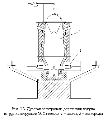 Шведская фирма ASEA в 1947 г. разработала для крупных ДСП устройство электромагнитного перемешивания расплавленного металла. В 1960х гг. в США стали применять печи емкостью 400-800 т с трансформаторами мощностью до 200 МВ-А. В конце 1970-х гг. фирма «Маннесман» (ФРГ) стала применять систему донной разливки стали и охлаждаемые стены и свод. Все эти разработки были направлены на увеличение производительности печей. В 1980-е гг. наиболее перспективными направлениями развития ДСП в нашей стране и за рубежом явились дуговые печи с питанием на постоянном токе, что существенно снизило потери в короткой сети, и печи с водоохлаждаемой футеровкой и сводом для работы в дуплекс-процессе, т. е. практически только для расплавления шихты. Во ВНИИЭТО (А. Н. Попов, Л. С. Кацевич и др.) был проведен ряд исследований и конструкторских разработок в этих направлениях. Разработанная во ВНИИЭТО ДСП постоянного тока емкостью 12 т была введена в эксплуатацию в 1981 г. В 1984 г. на Оскольском электрометаллургическом комбинате (Белгородская область) установлены две ДСП емкостью по 150 т с трансформатором 90 МВ-А. В футеровке стен печи использованы водоохлаждаемые панели. Дуговые печи косвенного нагрева. Дуговая барабанная качающаяся печь с двумя горизонтальными электродами разработана в Корневильском университете (Нормандия) в 1915 г. (Х. В. Жиллетт) и изготовлена в 1917 г. В 1918 г. фирма по производству электропечей в г. Детройте (США) начала серийное производство этих однофазных печей для переплава медных сплавов. Попытки изменить конструкцию (ввести вращение ванны или три электрода с трехфазным питанием) оказались неудачными. В СССР печи такого типа изготавливались на Московском электрозаводе с 1929 г. В настоящее время дуговые печи косвенного нагрева не выдерживают конкуренции с индукционными плавильными печами. Рудовосстановительные (руднотермические) печи. В начале XX в. были созданы двухэлектродные печи постоянного или переменного тока для производства карбида кальция мощностью до 4000 кВ-А. Эти печи использовались также для производства ферросплавов. А. Хельфенштейн (Австрия) ввел в эксплуатацию трехфазные печи мощностью до 12 МВ-А с проводящим угольным подом, присоединенным к нейтральному проводу. В 1907 г. в Норвегии была пущена печь мощностью 24 МВ-А, представлявшая собой практически сдвоенную печь (две трехфазные системы в одном кожухе). Для улучшения условий труда уже в 1910 г. была создана конструкция полузакрытой печи с отсосом газов. С 1895 г. разрабатываются конструкции электропечей для получения чугуна из железной руды. В 1908 г. в Швеции была построена дуговая печь (электрическая домна) мощностью 700 кВт с питанием от сети 25 Гц. В дальнейшем в Швеции и Норвегии были пущены несколько подобных усовершенствованных печей: двухфазная с четырьмя электродами мощностью 1850 кВт с использованием древесного угля, трехфазная с шестью электродами, а в 1913 г. - трехфазная конструкции А. Хельфенштейна мощностью 7360 кВт с использованием кокса. В 1925 г. в Норвегии (фирма «Электрохе- микс») была введена в эксплуатацию первая закрытая низкошахтная прямоугольная печь мощностью 6 МВ-А. В СССР первые ферросплавные печи (открытые) мощностью 800 и 1600 кВ-А изготовлены Московским электрозаводом в 1932 г. В 1934 г в г. Запорожье пущены печи фирмы «Мигэ» (Франция) мощностью 10 МВ-А для получения алюмината бария и ферро