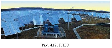 ГелиоэлектростанцииГелиоэлектростанции (ГЛЭС) используют тепловую энергию солнечных лучей (рис. 4.12) с помощью приемников двух видов: плоских, улавливающих солнечные лучи, направленные перпендикулярно плоскости (приемники отслеживают направление солнечных лучей, автоматически разворачивая свою плоскость); концентрирующих, в которых солнечные лучи с помощью зеркальных сферических поверхностей концентрируются в фокусе, где расположены тепловые элементы установки (например, паровой котел). Сконструированы солнечные электростанции на полупроводниковых фотоэлементах (кремниевых, селеновых и др.). В таких установках солнечная энергия непосредственно превращается в электрическую энергию. В конце XX в. в США и России был создан двухслойный полупроводниковый фотоэлемент из арсенида галлия, который преобразует в электричество видимую часть солнечного спектра, а инфракрасная часть спектра, проходящая через этот прозрачный слой, поглощается и преобразуется в электричество во втором слое - антимониде галлия или арсениде алюминия. В итоге КПД такого фотоэлемента составляет примерно 30-37 %, что сопоставимо с КПД современных тепловых и атомных электростанций (у обычных фотоэлементов в настоящее время КПД составляет 10-12 %). Коэффициент полезного действия современной ГЛЭС - 5-10 %, стоимость энергии ГЛЭС в 5-10 раз выше стоимости энергии, вырабатываемой традиционными электростанциями. Считается, что повышение КПД ГЛЭС до 20 % позволит стать ГЛЭС конкурентоспособным источником электрической энергии.