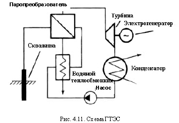 Геотермальные электростанцииГеотермальные электростанции (ГТЭС) используют внутреннее тепло Земли, геотермическую энергию гейзеров, термальных источников для тепло-фикации и производства электроэнергии (рис. 4.11). В России геотермальные источники существуют на Камчатке, Курильских островах, в Сибири [30]. Впервые геотермальная станция на глубинном паре давлением 5 атм и температурой 200 °С была построена в г. Лардерелло (Италия) в 1904 г. Геотермальные станции используются в Италии, Исландии, России, Японии, Новой Зеландии. В России, на Камчатке, в 1967 г. была построена Паужетская ГТЭС на 11 МВт, в 2000 г. запущена Мутновская ГТЭС на 200 МВт, в настоящее время строится Паратунковская ГТЭС.