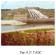 Гидроаккумулирующие электростанцииГидроаккумулирующие электростанции (ГАЭС) предназначаются для покрытия графика электрической нагрузки энергосистемы с использованием электроэнергии в период глубоких провалов нагрузки (рис. 4.17). Для работы таких станций необходимо иметь два водохранилища - верхнее и нижнее, расположенные друг от друга по высоте на 40-600 м. Между водохранилищами проложены трубы, по которым перекачивается вода с помощью насоса. В часы малого потребления энергии, обычно ночью, свободная электрическая энергия станции тратится на работу электродвигателей насосов, поднимающих воду из нижнего в верхнее водохранилище.