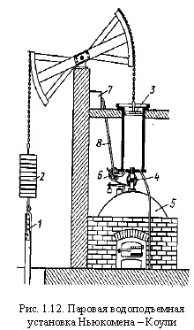 Начальный период развития теплового двигателяРанние попытки создания теплового двигателя как двигателя, не зависящего от местных условий, были связаны с решением задачи водоподъема. Устройством, в котором двигатель конструктивно слит с потребителем энергии, явился паровой водоподъемник англичанина Т. Севери, запатентованный им в 1698 г. В водоподъемнике Севери (рис. 1.11) вода в котел подавалась через кран 3, пар из котла 2 через открытый кран 4 поступал в камеру 1 и вытеснял из нее воду через нагнетательный клапан 6 при закрытом всасывающем клапане 7 в верхний резервуар 5. Затем кран 4 закрывался и камера поливалась холодной водой из специального резервуара. Пар в камере конденсировался, давление снижалось, и вода заполняла камеру через всасывающий клапан 7. Затем цикл повторялся.