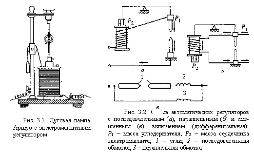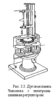 Эта лампа, в частности, применялась для освещения площади перед зданием Адмиралтейства в Петербурге. Большую известность получило применение десяти дуговых ламп с регуляторами талантливого русского изобретателя Александра Ильича Шпаковского (1823-1881) в 1856 г. при иллюминации на Лефортовском плацу в Москве во время торжеств по случаю коронации Александра II. Их по праву называли «электрическими солнцами Шпаковского». В них применялось комбинированное (электрическое и механическое) регулирование. Эти лампы были наиболее совершенными, в том числе по сравнению с зарубежными. По характеру электрической схемы питания регуляторы разделяли на три группы: с последовательным и параллельным питанием, дифференциальные (рис. 3.2). В регуляторах с последовательным питанием обмотка электромагнита включалась последовательно с дугой, а с параллельным - параллельно. В дифференциальном регуляторе горение дуги регулировалось как последовательной, так и параллельной обмотками. После включения лампы регулятор работал при любом положении углей. Электромагнитные регуляторы в дуговых электрических лампах, обеспечивающие автоматическое регулирование расстояния между электродами дуги, были самыми распространенными электрическими устройствами в 50-70-х гг. XIX в. До появления свечи Яблочкова в 1876 г. электромагнитный регулятор являлся наиболее важным конструктивным узлом дуговых ламп, без которого последние не могли работать. Большинство дуговых ламп различалось только устройством регулятора. Наиболее совершенные дифференциальные регуляторы были разработаны в 1869-1870 гг. известным русским электротехником, одним из основателей журнала «Электричество» Владимиром Николаевичем Чиколевым (1845-1898). Им впервые в мировой электротехнической практике был применен метод электромашинного регулирования. На рис. 3.3 показана дуговая лампа с электромашинным регулятором.