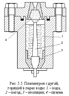 Плазменный нагревНачальный период. Начало работ по плазменному нагреву относится к 20-м гг. XX в. Термин «плазма» ввел И. Ленгмюр (США), а понятие «ква- зинейтральная» - В. Шоттки (Германия). В 1922 г. X. Гердиен и А. Лотц (Германия) провели опыты с плазмой, полученной при интенсивном охлаждении электрической дуги путем применения металлической диафрагмы и тангенциальной подачи воды. Затем в течение ряда лет проводились исследования физических свойств электрической дуги и плазмы, и только в 1950-х гг. начались разработки промышленных плазмотронов и плазменных технологических процессов [15]. Дуговые плазмотроны. В 1954 г. Т. Петере (США) создал плазмотрон, представляющий собой камеру, в которой дуга горит в парах воды при давлении до 500 МПа (рис. 5.5). На выходе из сопла получены высокие сверхзвуковые скорости плазмы. Фирмы США («Линде», «Плазмадин») с 1955 г. стали применять плазмотроны для нанесения покрытий (алюминий, вольфрам), а также для резки и сварки металлов. В СССР развитие плазменного нагрева началось в конце 50-х - начале 60-х гг. прошлого века. Под руководством М. Я. Смелянского работы по применению плазменного нагрева велись на кафедре электротермических установок МЭИ. Во ВНИИЭТО (Н. И. Борт- ничук, В. А. Хотин) в 1961 г. была запущена первая плазменная печь - стенд мощностью 30 кВт, а затем создана лабораторная плазменная печь для плавки сталей и тугоплавких металлов (1965). В 1970 г. пущена в эксплуатацию плазменная печь для плавки стали в керамическом тигле емкостью 3,5 т (Челябинск) и созданы дуговые плазмотроны и источники питания для плавильных печей на токи 1, 3 и 6 кА.
