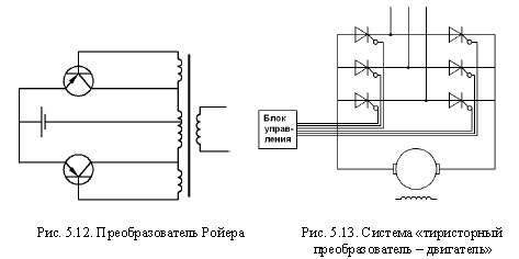Полупроводниковые приборы в электроприводеВ послевоенные годы в ведущих лабораториях мира произошел прорыв в области силовой электроники, кардинально изменивший многие сферы техники и, в частности, электропривод. В 1948 г. Дж. Бардин и В. Браттейн (Белловская лаборатория, США) создали первые транзисторы. В конце 1950-х - начале 1960-х гг. на первых, еще очень несовершенных силовых транзисторах (ток - 5 А, напряжение - 60 В), работавших в ключевом режиме, было построено множество оригинальных схем для питания маломощных двигателей и для цепей возбуждения мощных двигателей, например известный преобразователь Ройера (рис. 5.12), преобразовывавший постоянное напряжение в прямоугольное переменное с управляемой частотой, и множество модификаций этой схемы. В технику электропривода начал входить управляемый ключ и построенные на его основе устройства.