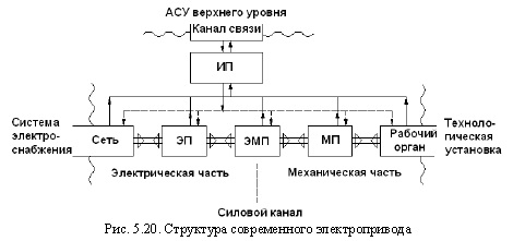 Нетрадиционные электромеханические устройства (линейные, поворотные, планарные многокоординатные двигатели и т. п.) в сочетании с развитыми микропроцессорными средствами управления образуют электромеханические структуры, интегрированные в технологическое оборудование и создающие принципиально новый тип технологической среды. Интенсивно осваиваются новые виды регулируемого электропривода - вентильно-индукторный, с другими нетрадиционными электрическими машинами. В микроприводе миниатюрных роботов применяются тонкопленочные диэлектрические двигатели. С конца прошлого века в мире интенсивно реализуется тенденция перехода от нерегулируемого электропривода к регулируемому в массовых применениях: насосы, вентиляторы, конвейеры и т. п., благодаря чему резко повышается технологический уровень оборудования, экономятся значительные энергетические ресурсы. Электропривод сформировался сегодня как система, осуществляющая управляемое электромеханическое преобразование энергии и состоящая в общем случае из электрического (ЭП), электромеханического (ЭМП) и механического (МП) преобразователей, образующих силовой канал, измерительных преобразователей (ИП), преобразующих информацию, и управляющих устройств, входящих в информационный канал (рис. 5.20).