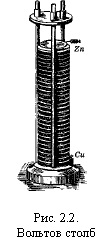 Создание первого источника электрического токаВ течение нескольких лет (1792-1795) А. Вольта (рис. 2.1) не только повторил все опыты Л. Гальвани, но и произвел ряд новых исследований. И если Л. Гальвани искал причину обнаруженных им явлений как физиолог, то А. Вольта, будучи физиком, искал в них физические процессы [6, 7]. Прежде всего он обратил внимание на факт, уже известный Л. Гальвани, что сокращения мышц наиболее интенсивно происходят при использовании двух разнородных металлов. Продолжая исследования, он отверг идеи Л. Гальвани о «животном» электричестве и пришел к выводу, что источником электричества является контакт двух разнородных металлов: «Металлы не только прекрасные проводники, но и двигатели электричества. ...Лягушка, приготовленная по способу Гальвани, есть чувствительнейший электрометр», - утверждал А. Вольта [9]. Обобщением исследований А. Вольта была предложенная им теория «контактного электричества», суть которой такова: при соприкосновении различных металлов происходит разложение их «естественного» электричества; при этом электричество одного знака собирается на одном металле, а другого - на другом. Силу, возникающую при контакте двух металлов и разлагающую их «естественное» электричество, А. Вольта назвал электровозбудитель- ной, или электродвижущей, силой; эта сила «перемещает электричество так, что получается разность напряжений» (между металлами. - Авт .) [8]. Исследовав этот вопрос при помощи созданного им весьма чувствительного прибора - электроскопа с конденсатором, А. Вольта установил, что металлы можно распределить в некоторый ряд, в котором «разность напряжений» между двумя металлами будет тем больше, чем дальше они расположены один от другого. С современной точки зрения совершенно очевидна ошибочность идеи Вольта о возможности получения электрического тока посредством простого контакта разнородных металлов, т. е. получения электрической энергии без затраты для этого какого-либо другого вида энергии. Однако в начале XIX в. эта теория контактного электричества нашла много сторонников и на некоторое время удержалась в науке. Многочисленные эксперименты привели А. Вольта к выводу, что непрерывный электрический «флюид» может возникнуть лишь в замкнутой цепи, составленной из различных проводников - металлов (которые он называл «проводниками первого класса») и жидкостей (названных им «проводниками второго класса»). Опыты А. Вольта завершились построением в 1799 г. первого источника непрерывного электрического тока, составленного из медных и цинковых кружков (пар), переложенных суконными прокладками, смоченными водой или кислотой. Этот прибор, о котором он впервые сообщил президенту Лондонского королевского общества в марте 1800 г., был назван им «электродвижущим аппаратом», а позже французы стали его называть «гальваническим или вольтовым столбом» (рис. 2.2).