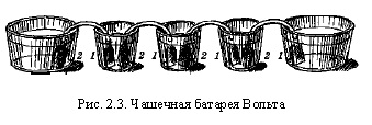 Необходимость применения проводников второго класса (суконных кружков, смоченных водой или кислотой) А. Вольта объяснял следующим: при соприкосновении двух различных металлов электричество одного знака сосредоточивается на одном металле, а электричество противоположного знака - на другом. Если составить столб из нескольких пар различных металлов, например цинка и серебра (без прокладок), то каждая цинковая пластина будет находиться в соприкосновении с одинаковыми серебряными пластинами и их общее действие будет взаимно уничтожаться. Для того чтобы действие отдельных пар суммировалось, необходимо обеспечить соприкосновение каждой цинковой пластинки только с одной серебряной. Это осуществляется с помощью проводников второго рода - суконных кружков, смоченных водой или кислотой, разделяющих пары металлов и не препятствующих движению электричества. Таким образом, А. Вольта, не понимая того, что электрический ток возникает в результате химических процессов между металлами и жидкостями, практически пришел к созданию гальванического элемента, действие которого основывалось именно на превращении химической энергии в электрическую. Хотя Вольта и заметил, что поверхности приведенных в контакт разнородных металлов, составляющих гальваническую пару, подвергаются изменению (окисляются), тем не менее он не придал этому факту никакого значения. А. Вольта предложил кроме столба еще и несколько иную конструкцию источника электрического тока - так называемую чашечную батарею (рис. 2.3), действие которой, по его мнению, также было основано на контакте между двумя металлами (влажную суконную прокладку столба заменяла жидкость). Чашечная батарея представляла собой соединение отдельных элементов, имевших форму банок, наполненных разбавленной серной кислотой, в которую погружались одна медная и одна цинковая пластины. Кроме предложенных А. Вольта конструкций источника электрического тока вскоре были разработаны некоторые другие его модификации.