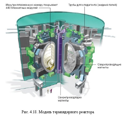 Принципиально возможно создание реакторов на водородном топливе, при этом в качестве отхода этой реакции будет газ гелий. Такие реакторы называются термоядерными или ТОКАМАК (рис. 4.18) - тороидальная камера с магнитными катушками. Термоядерный процесс был открыт и осуществлен в водородной бомбе, но там он протекает мгновенно и неуправляем, а для использования в энергетике он должен протекать медленно и быть управляемым (этот процесс протекает при температурах около 100 млн. °С). Установку ТОКАМАК можно сравнить с трансформатором, у которого вторичная обмотка выполнена в виде замкнутого полого кольца - тора. Заполнение такой кольцевой камеры тяжелыми ядрами водорода (дейтерием) осуществляется в глубоком вакууме. При пропускании тока по первичной обмотке в камере происходит пробой в газе, газ ионизируется и нагревается до высокой температуры. Конечно, здесь возникает много проблем, среди них создание устройств, выдерживающих температуру многих миллионов градусов. Это можно сделать при помощи магнитного поля, которое способно удержать плазму (ионизированный газ) от соприкосновения со стенками устройства, предохраняя их от температурного разрушения. Существует и еще много проблем, которые пытаются решить и постепенно разрешают ученые всего мира.