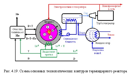 На рис. 4.19 показана схема основных технологических контуров термоядерного реактора, работающего на смеси дейтерия (D) и трития (Т). Энергия термоядерных реакций, происходящих в плазме, выделяется в виде энергичных нейтронов (14,1 МэВ) и энергичных ионов гелия - альфа-частиц (3,5 МэВ), поглощается специальным устройством, окружающим плазму, - бланкетом, снимается теплоносителем первого контура охлаждения и используется для получения электроэнергии. Реактор требует снабжения дейтерием и литием. Тритий нарабатывается из лития в процессе работы реактора. Использование термоядерных электростанций в промышленных целях также наталкивается на не преодоленные пока технические трудности, несмотря на то что принципиальная возможность их действия научно обоснована. Кроме того, термоядерная энергия способна создать недопустимый тепловой перегрев среды обитания (парниковый эффект и т. п.) и поэтому не может развиваться неограниченно. |
