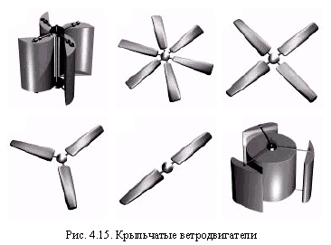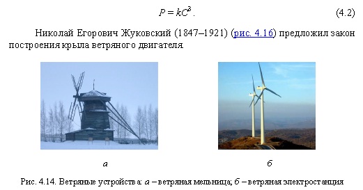 Ветровые электростанцииВетровые электростанции (ВЭС) используют энергию ветра, которая представляет собой преобразование энергии солнца, вызывающего движение неравномерно нагретых воздушных масс. Теоретические запасы энергии ветра в 100 раз превышают запасы гидроэнергии всех рек земного шара. Принято считать, что возможно реально использовать для нужд энергетики до 10 % теоретических запасов энергии ветра. Строительство ВЭУ (ветроэнергетических установок) имеет многовековую историю, начиная с ветряных мельниц (рис. 4.14, а) и до современных установок (рис. 4.14, б) [30, 311. Энергия ветра используется человечеством уже несколько тысячелетий, но для выработки электроэнергии - в основном в ХХ в. Чаще всего изготавливают ветродвигатели крыльчатого типа. Диаметр крыльев бывает от 8 до 30 м и более, а мощность таких установок - от 1 до 1000 кВт и более (рис. 4.15). Мощность ветрового двигателя Р, кВт, определяется произведением скорости ветра С, м/с, и коэффициента полезного действия установки к: ![]()