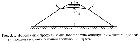 Элементы трасс железных дорогТрасса железной дороги — это продольная ось железнодорожного пути на уровне профильной бровки основной площадки земляного полотна (рис. 3.1). На двухпутных и многопутных дорогах определяют трассу каждого из путей. План трассы — это проекция ее на горизонтальную плоскость. План состоит из отрезков прямых, пересекающихся под различными углами и сопрягаемых криволинейными участками пути. Продольный профиль железной дороги представляет собой развернутую на плоскость вертикальную цилиндрическую поверхность, проходящую через трассу. Изображение трассы на этой развертке называется проектной линией продольного профиля. Кроме того, на продольном профиле изображается линия поверхности земли, указываются характеристики грунтов, искусственные и другие линейные сооружения. На продольных профилях, составляемых при проектировании путей на застроенной территории, в качестве проектной линии принимается вместо бровки земляного полотна уровень головки рельса проектируемого пути (на криволинейных участках — внутреннего рельса). При проектировании дополнительных главных путей или усилении (реконструкции) существующих железных дорог на продольном профиле наносится линия в уровне головки рельса существующего пути и проектная линия в уровне головки рельса проектируемого пути.