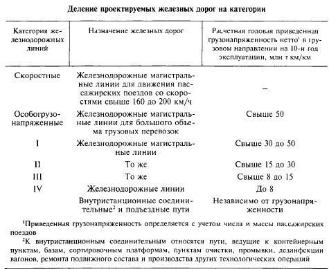СНиП и СТН предусматривают следующие максимальные скорости движения пассажирских поездов на скоростных линиях — до 200 км/ч, на особогрузонапряженных линиях — до 120 км/ч (при соответствующем обосновании допускается скорость свыше 120 км/ч, но не более 160 км/ч), на линиях 1 и II категорий — до 160 км/ч, III категории — до 120 км/ч и IV категории — до 80 км/ч (подъездные и внутристанционные соединительные пути при максимальной скорости движения поездов свыше 80 км/ч проектируют по нормам железнодорожных линий III категории). Если грузонапряженность новой проектируемой линии или скорость движения поездов имеют перспективу роста за пределами 10-го года эксплуатации, то при соответствующем технико-экономическом обосновании допускается проектировать легкопереустраиваемые сооружения и устройства (верхнее строение пути, связь и др ) по нормам категории, установленной в соответствии с табл 1 1, а труднопереустраиваемые сооружения (земляное полотно, искусственные сооружения, элементы плана и профиля и др.) — по нормам более высокой категории. Изыскания и проектирование железных дорог. — М.: ИКЦ «Академкнига», 2003. - 288 с.. |