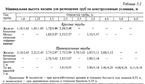 Определение отверстий и выбор типа малых водопропускных сооруженийОтверстия малых водопропускных сооружений подбирают по графикам их водопропускной способности (см. рис. 5.13—5.20; 5.22). Принятое отверстие должно обеспечивать сохранность водопропускных сооружений и подходных насыпей при расчетном и наибольшем расходах воды. Обеспечение сохранности труб. Для сохранности трубы необходимо при расчетном расходе воды обеспечить указанное в Строительно-технических нормах (см. п. 5.3) наименьшее возвышение высшей точки внутренней поверхности трубы над уровнем потока на входе в трубу. Для этого отверстие трубы подбирают по графикам на рис. 5.13—5.16 таким образом, чтобы точка пересечения кривой водопропускной способности данной трубы и абсциссы, соответствующей значению расчетного расхода, находилась в зоне расчетных расходов, ограниченной на графиках линией со штрихов-кой вниз. Необходимо также обеспечить минимальную толщину засыпки над трубой (от поверхности трубы до подошвы рельса), которая для бетонных и железобетонных труб составляет 1 м, а для металлических — 1,2 м (толщину засыпки над железобетонными трубами, расположенными в пределах станций, допускается принимать не менее 0,5 м). Это требование определяет минимальную высоту насыпи для размещения труб (табл. 5.2) в зависимости от высоты трубы в свету, толщины звена или плиты перекрытия, а также конструкции верхнего строения пути (высоты шпалы и толщины балласта под шпалой) [30].