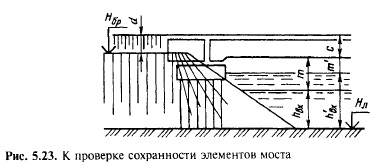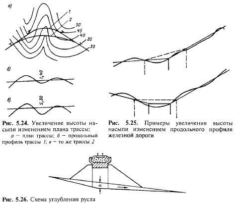Обеспечение сохранности мостов. Гидравлическая сохранность мостов обеспечивается в том случае, если русло под мостом не размывается. Для этого в соответствии со скоростью воды при пропуске расчетного расхода, которая зависит от глубины напора, принимают тип укрепления подмосто- вого русла. При пропуске наибольшего расхода скорость течения воды возрастает. Чтобы предотвратить чрезмерный размыв русла, не допускается увеличение этой скорости более чем на 20 % по сравнению с принятой при пропуске расчетного расхода. Если это условие не соблюдено, то следует увеличить отверстие моста. Сохранность пролетного строения и других элементов моста (например, подферменных площадок), достигается соответствующим расположением их над уровнем воды при входе потока под мост. С учетом этого проектная отметка по оси моста (отметка в уровне бровки земляного полотна) НьР (рис. 5.23) должна удовлетворять условию: ![]() ![]() Сохранность элементов моста определяется при пропуске расчетного расхода, когда глубина потока на входе под мост равна /гвх, и при пропуске наибольшего расхода, когда глубина потока /4, (см. рис. 5.23). Например, возвышение низа пролетных строений мостов над уровнем потока на входе под мост согласно нормам должно быть при пропуске расчетного расхода т = 0,5 м (когда глубина подпертой воды не более 1 м) и т = 0,75 м (когда глубина подпертой воды более 1 м), а при пропуске наибольшего расхода т' = 0,25 м независимо от глубины подпертой воды. Для размещения бетонных труб высотой 3 м насыпь должна быть не ниже 4—4,35 м (см. табл. 5.2). При высоте насыпи 2 м и более можно также сооружать сборные железобетонные мосты эстакадного типа. Если высота насыпи недостаточна для размещения водопропускного сооружения, то можно принять одно из следующих решений: сместить трассу в плане в низовую сторону по косогору, для того чтобы пересечь лог на более низких отметках и тем самым увеличить высоту насыпи; такие решения наиболее вероятны на участках напряженного хода (рис. 5.24); поднять проектную линию продольного профиля при неизменном плане трассы, что наиболее просто на участках вольного хода, если это не приводит к значительному увеличению объема земляных работ (рис. 5.25); взамен одноочковой использовать двух- или трехочковую трубу при меньшем отверстии каждого очка и соответственно меньшей высоте трубы; увеличить число пролетов моста, а следовательно, и отверстие. При этом снизится скорость течения воды под мостом, уменьшатся напор и, соответственно, требуемая высота насыпи; углубить русло с соответствующим понижением отметок лотка и уровня подпертой воды (рис. 5.26).