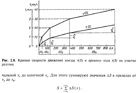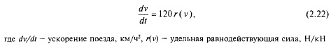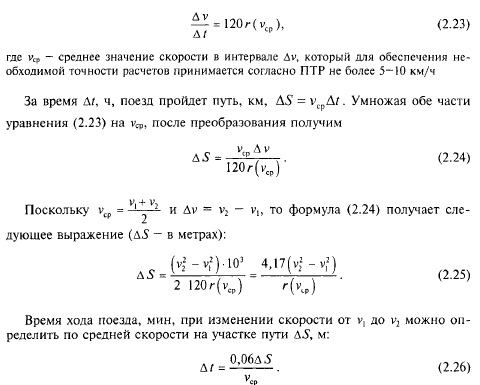 На перегоне, где уклоны элементов профиля различны, непосредственное использование формулы (2.25) неудобно, поскольку нельзя заранее установить значение конечной скорости в конце элемента, когда при переходе к другому элементу профиля изменяется равнодействующая сила, зависящая от уклона пути. При определении скорости движения поезда на перегоне целесообразно преобразовать формулу (2.25) следующим образом: ![]()