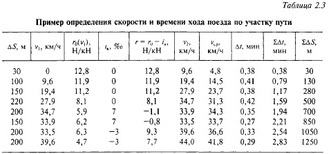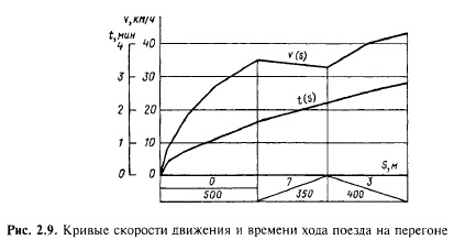 Как следует из рис. 2.8 и 2.9, полученные расчетами данные позволяют определить скорость движения и время хода поезда в любой точке пути. Рассмотренные методы численного интегрирования уравнения движения поезда позволяют автоматизировать расчеты скорости движения и времени хода поезда. Для некоторых расчетов при проектировании железных дорог (например, для предварительного размещения осей станций и разъездов) время хода поезда определяют приближенным методом установившихся скоростей. В результате расчета удельных равнодействующих сил определяют установившиеся скорости движения поезда на разных уклонах (см. п. 2.2). Исходя из предположения, что на каждом элементе профиля поезд быстро достигает установившейся скорости v км/ч, вычисляют время хода поезда на 1 км пути при данном уклоне t, = 60/v„ мин/км, а затем время хода поезда по участку определяют по формуле