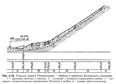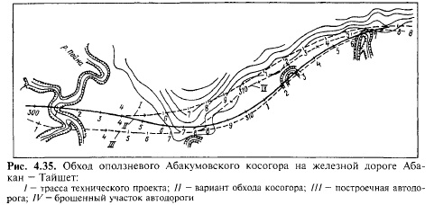 На железной дороге Абакан — Тайшет Абакумовский косогор (правобережный склон р. Поймы) заканчивался у поворота реки мысом, который по принятому проекту прорезался выемкой глубиной по оси 16,6 м. Когда выемку разработали на глубину 12 м, был вскрыт водоносный горизонт и начались деформации нагорного откоса выемки: образовались оползни протяженностью до 25 м и глубиной до 4 м. Дополнительными обследованиями были обнаружены плоскости скольжения, в пределах которых породы перетерты до состояния глин. Для обеспечения устойчивости земляного полотна на Абакумовском косогоре был рассмотрен ряд вариантов, включая уположение откосов выемки и устройство глубоких дренажей на подоткосной поверхности. Принят был наиболее экономичный вариант полного обхода неустойчивого косогора по пойме (рис. 4.35) с отводом русла реки на расстояние 100 м от трассы дороги.