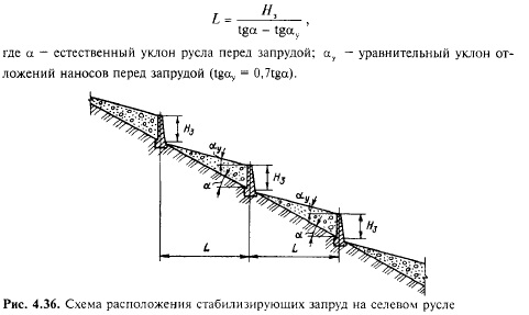 Сплывами называют малые оползни глубиной до 1 м, охватывающие небольшие (до сотни квадратных метров) площади на поверхности склона или откоса выемки. Сплывы распространены чаше всего на откосах молодых выемок (возрастом до 5 лет). Они появляются вследствие насыщения грунта откосов поверхностными водами или из-за выхода грунтовых вод на поверхность откосов, сложенных глинистыми грунтами, особенно пылеватыми. Наиболее часто сплывы происходят, если откосы выемок сложены пучащими грунтами. Для предупреждения сплывов из-за пучения грунта применяют известные приемы борьбы с пучинами, приспособив их к использованию на откосах. Сель — это внезапный горный грязевой поток с большим количеством твердых включений. На территории России селеопасные районы распространены на Северном Кавказе, в некоторых областях Прибайкалья, Забайкалья и Дальнего Востока. При трассировании железных дорог в районах с селевыми потоками следует прежде всего рассмотреть вариант обхода трассой селевых русел. Если это невозможно, то предусматривают противоселевые защитные сооружения: селепропускные, селенаправляющие и стабилизирующие [26]. Пропуск селевого потока через железную дорогу желательно осуществлять в узком месте лога (где русло фиксировано высокими устойчивыми берегами) однопролетным мостом отверстием не менее 4 м. В случае если такой вариант осуществить трудно, следует рассмотреть возможность пересечения селевого русла у подножья склонов с пропуском селевого потока над путем селеспуском (сооружение типа акведука — см. гл. 5). Селенаправляющие сооружения (дамбы) предусматриваются для направления потока в селе пропускное отверстие или отвода селевого потока от защищаемого объекта. Стабилизирующие защитные сооружения возводят для задержки селевого потока или уменьшения его кинетической энергии. Для этого в русле выше места пересечения его трассой железной дороги сооружают систему запруд (рис. 4.36). Высоту запруд над дном русла Я3 принимают от 2 до 5 м, а расстояние между ними по горизонтали