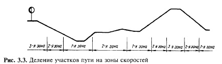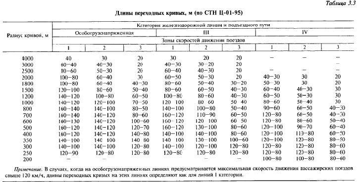 Согласно Строительно-техническим нормам СТН Ц-01-95 [17] на новых скоростных железных дорогах, а также линиях 1 и II категорий длины переходных кривых определяют в соответствии с зависимостями (3.8) и (3.9). На особогрузонапряженных линиях, а также линиях III и IV категорий и подъездных путях длины переходных кривых принимают по табл. 3.3 (из СТН Ц-01-95) в зависимости от радиуса сопрягаемой кривой и категории проектируемой линии. Эти длины рассчитаны по формулам (3.8) и (3.9), при этом учтено, что в кривой данного радиуса наибольшие скорости движения реализуются только при определенном профиле пути (например, на затяжном спуске), где требуется наибольшее возвышение наружного рельса. На других участках (например, на возвышениях профиля) скорость поездов меньше, поэтому меньше возвышение наружного рельса и можно соответственно уменьшить длину переходной кривой. Поэтому в табл. 3.3 длины переходных кривых при каждом значении радиуса приведены в зависимости от зоны скоростей, в которой находится участок пути, где проектируется данная кривая. Эти зоны установлены в зависимости от очертания продольного профиля пути (рис. 3.3). К 1-ой зоне относятся участки, проходимые грузовыми поездами с максимальными скоростями, ко 2-ой зоне — со средними скоростями и к 3-й - со скоростями, близкими к расчетной скорости на руководящем подъеме. При двух значениях длин переходных кривых в данной графе табл. 3.3 меньшая длина кривой соответствует большему уклону отвода возвышения наружного рельса. Эту меньшую длину переходной кривой допускается применять только в трудных условиях. Строительно-технические нормы предусматривают также, что в технико-экономически обоснованных случаях при проектировании участков железных дорог особогрузонапряженных, III и IV категорий, располагаемых в трудных условиях, где не может быть реализована скорость движения поездов, допускаемая принятым радиусом кривой, длину переходных кривых можно устанавливать расчетом по формуле (3.6). При этом уклон отвода возвышения должен быть не более 0,001, а в трудных условиях на особогрузонапряженных линиях, а также на линиях III и IV категорий — не более 0,002, на подъездных путях - 0,003. Эти предельные значения уклонов установлены из условия предотвращения схода колес с рельсов внутренней нити при движении экипажа в переходной кривой. ![]()
