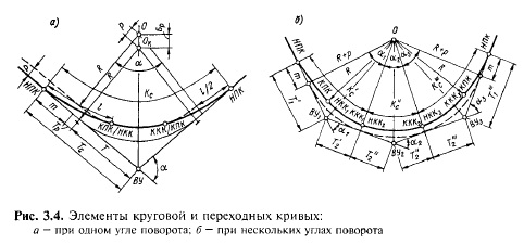 Минимальные углы поворота. При малых углах поворота и соответственно коротких кривых необходимо проверить возможность устройства переходных кривых. Для устройства переходных кривых необходимо соблюдение условия* (см. рис. 3.4, а)