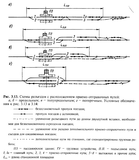 Разъезд продольного типа с разносторонним относительно главного пути расположением приемоотправочных путей (см. рис. 3.13,6) следует проектировать при большом числе пассажирских поездов, пропускаемых через разъезд с обгоном грузовых, а также при необходимости расположения погрузочновыгрузочных плошадок по обе стороны главного пути. Однако для разъездов продольного типа необходима станционная площадка наибольшей длины, которую можно обеспечить в благоприятных топографических условиях. В более сложных условиях при ограниченной длине станционной площадки допускается проектировать разъезды с полу продольным размещением приемоотправочных путей (рис. 3.13,в). Величина смещения путей может быть различна в зависимости от длины станционной площадки, но обязательно должна допускать установку пассажирского поезда в пределах полезной длины главного пути у пассажирского здания. Разъезды с поперечным расположением приемоотправочных путей (рис. 3.13,г) размещаются на станционной площадке наименьшей длины и требуют наименьших капиталовложений. Однако на этих разъездах невозможна остановка соединенных поездов для скрещения (или технического обслуживания вагонов) и ухудшаются условия одновременного приема поездов противоположных направлений (до входных стрелок длительное время поезда следуют навстречу один другому по главному пути, что требует большого эмоционального напряжения машинистов локомотивов). Поэтому разъезды поперечного типа проектируют, как правило, лишь на железных дорогах IV категории, а на дорогах I, II и III категорий эти разъезды предусматривают только в трудных топографических и инженерногеологических условиях, а также в районах, где возможны снежные и песчаные заносы, поскольку на более коротких разъездах легче вести борьбу с заносами. Рассмотренные схемы разъездов предусматривают, как правило, двустороннюю специализацию всех приемоотправочных путей. Для обеспечения приема двух пассажирских поездов с противоположных направлений с остановкой на разъезде или в случае односторонней специализации путей вторую пассажирскую платформу располагают с внешней стороны пути 2 (показано штриховыми линиями на рис. 3.13). При проектировании на разъезде одного разъездного пути (когда размеры движения в сутки не превышают 12 пар поездов параллельного графика) этот путь, как правило, располагают относительно главного пути со стороны противоположной пассажирскому зданию с учетом положения будущего второго главного пути. Сферы применения промежуточных станций различного типа (рис. 3.14) аналогичны рассмотренным выше применительно к разъездам. Станции поперечного типа применяются, как правило, на линиях с небольшими размерами движения, а на железных дорогах с большим объемом перевозок — лишь в трудных топографических и инженерногеологических условиях или как первый этап развития промежуточной станции в станцию продольного или полупродольного типа. Грузовые устройства, как правило, располагают со стороны, противоположной пассажирскому зданию. При небольших размерах движения и грузовой работы, в зависимости от местных условий (расположение предприятий и автодорог, а также топографические, инженерногеологические условия и др.) грузовые устройства могут быть размещены со стороны пассажирского здания (см. рис. 3.14,6).