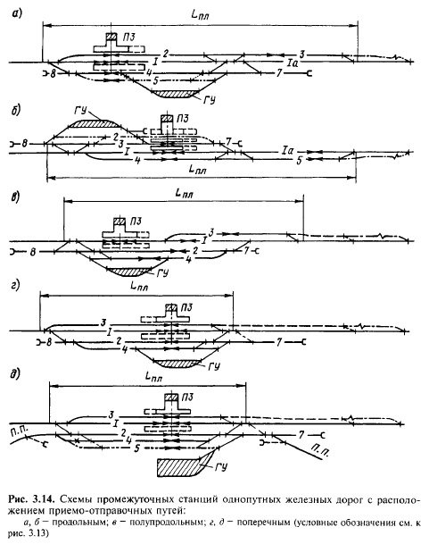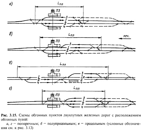 Из различных типов обгонных пунктов на двухпутных железных дорогах самым распространенным является обгонный пункт поперечного типа (рис. 3.15,а), размещаемый на наиболее короткой площадке. Обгонные пункты полупродольного типа со смещенным расположением обгонных путей (рис. 3.15,6) применяют в тех случаях, когда такое расположение путей (по очертанию продольного профиля станционной площадки) облегчает разгон грузовых поездов после трогания с места или когда необходимо разместить погрузочновыгрузочные площадки по обе стороны главного пути. Эта схема приемоотправочных путей имеет также преимущество в отношении пропуска нечетных пассажирских поездов с остановкой по главному пути. Обгонные пункты продольного типа (рис. 3.15,в) применяют на линиях со скоростным движением пассажирских поездов (поэтому расстояние между осями главных путей в пределах обгонного пункта принимают таким же как на прилегающих перегонах), а также когда необходимо иметь дополнительную длину участка пути для грузовых операций и осуществлять передачу поездов с одного направления на другое. Обгонный пункт поперечного типа с последовательным расположением обгонных путей (рис. 3.15,г) может применяться при значительных размерах пассажирских перевозок, когда применение обгонного пункта поперечного типа по рис. 3.15,а нецелесообразно.