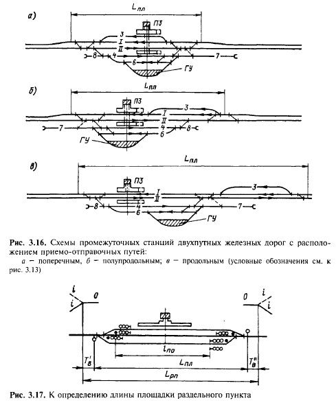 Промежуточные станции на двухпутных линиях проектируют с поперечным, полупродольным и продольным расположением приемо отправочных путей (рис. 3.16) применительно к аналогичным схемам станций однопутных линий. Длина площадок станций, разъездов и обгонных пунктов. Длина площадок раздельных пунктов Lni, определяемая между крайними входными стрелками (рис. 3.17), зависит от схемы путевого развития раздельных пунктов, полезной длины приемоотправочных путей на перспективу, числа путей и марки крестовин стрелочных переводов.