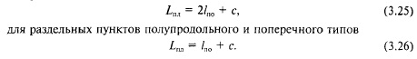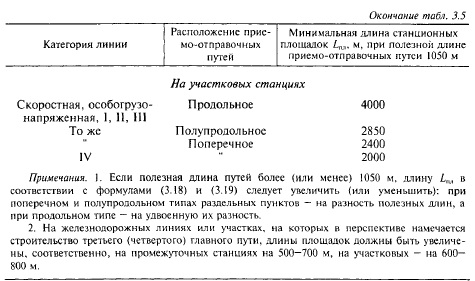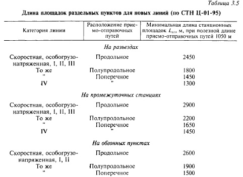 Величина с зависит от типа раздельного пункта, а также от категории проектируемой линии (наибольших скоростей движения поездов, определяющих марку крестовин стрелочных переводов). Например, на скоростных, особогрузонапряженных магистралях и железных дорогах I—III категорий для разъездов продольного типа с = 350 м, полупродольного типа с = 750 м, поперечного типа с = 400 м. На линиях IV категории для разъездов поперечного типа с = 250 м. Длины раздельных пунктов на железных дорогах различных категорий при полезной длине приемоотправочных путей 1050 м согласно СТН Ц0195 приведены в табл. 3.5. ![]()