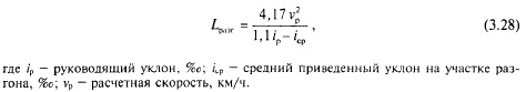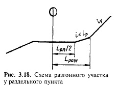 На железных дорогах, проектируемых с электрической тягой на постоянном токе, при расположении раздельного пункта в яме и на уступе необходимо обеспечить разгон полногрузных поездов до расчетной скорости электровоза vp к моменту выхода поезда на затяжной ограничивающий подъем. Это обусловлено тем, что разгон поезда на ограничивающем подъеме не допускается изза быстрого перегрева пусковых резисторов электровоза, а движение поезда по затяжному подъему со скоростью меньшей, чем расчетная, привело бы к существенному увеличению времени хода. Необходимая длина разгонного участка может быть установлена точным тяговым расчетом с учетом длины поезда. Приближенно ее можно определить по формуле