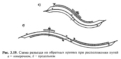 План путей на раздельных пунктах. Наиболее благоприятные условия для выполнения операций на раздельных пунктах обеспечиваются при расположении их на прямых участках пути. Такое расположение раздельных пунктов предусмотрено Строительнотехническими нормами. Лишь в трудных условиях местности, когда размещение раздельных пунктов на прямой приводит к значительному увеличению объемов строительных работ или удлинению линии, их можно располагать на кривых радиусом не менее 2000 м — на скоростных линиях, 1500 м — на линиях I и II категорий, 1200 м — на линиях особогрузонапряженных, III и IV категорий. В особо трудных топографических условиях на линиях особогрузонапряженных, III и IV категорий при соответствующем обосновании допускается уменьшать радиус кривой до 600 м, а в горных условиях — до 500 м (в случаях, когда на особогрузонапряженных линиях предусматривается максимальная скорость движения пассажирских поездов свыше 120 км/ч, радиусы кривых на раздельных пунктах этих линий принимают по нормам, предусмотренным для железных дорог I категории). Расположение раздельных пунктов на нескольких кривых разрешается в том случае, когда кривые направлены в одну сторону. Прямые вставки между этими кривыми проектируют как на перегонах. Размещение раздельных пунктов с поперечным расположением приемо отправочных путей на обратных кривых (рис. 3.19,а) исключило бы возможность наблюдения с головы хвоста поезда и резко ухудшило бы наблюдение за сигналами при отправлении поезда. Поэтому согласно нормам проектирования железных дорог размещение разъездов и обгонных пунктов на обратных кривых допускается лишь в исключительных случаях на линиях III и IV категорий при соответствующем обосновании в проекте.