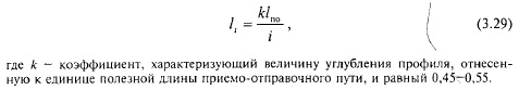 Расчеты показывают, что с учетом полного оснащения вагонного парка роликовыми подшипниками уклоны, обеспечивающие трогание с места составов расчетной массы Q, значительно круче уклонов, определяемых зависимостями (3.31) и (3.34). Таким образом, наибольшую крутизну приведенных уклонов /к, допускаемых на раздельных пунктах в указанных выше условиях, можно определять при одиночной тяге по формуле (3.33), а при кратной тяге по формулам соответственно (3.35) или (3.36). При определении допускаемого действительного уклона (в случае расположения раздельного пункта на кривой) к уклону, вычисленному по указанным формулам, следует прибавить уклон /3, эквивалентный дополнительному сопротивлению от кривой. В соответствии с требованием Строительнотехнических норм СТН Ц0-195 во всех случаях наибольший уклон станций, разъездов и обгонных пунктов не должен превышать 10%о. Это ограничение облегчает остановку поезда, следующего на спуск, с достаточной точностью в пределах полезной длины приемоотправочных путей. Если раздельный пункт располагается на нескольких элементах профиля, то длину и сопряжение элементов проектируют по тем же нормам, что и на перегонах. Изыскания и проектирование железных дорог. — М.: ИКЦ «Академкнига», 2003. - 288 с.. |