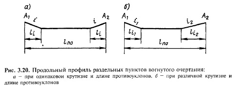 В зависимости от топографических условий раздельного пункта уклоны и соответственно длины элементов с противоуклонами могут быть различны (см. рис. 3.20,6), однако они должны соответствовать формуле (3.29) при одинаковом для обоих элементов значении коэффициента к (чтобы точки А, и А2 располагались в одном уровне).