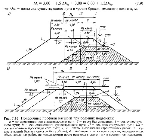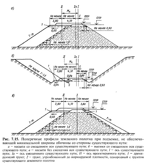 Подъемка в уровне подошвы рельсов Д/ггпМр = ППР — СПР меньше подъемки в уровне головок рельсов Ah (см. п. 7.5) на разность высоты существующего и укладываемого рельсов с подкладками; б) ось существующего пути сохраняется в прежнем положении, ось второго пути размещается на расстоянии нормального междупутья от оси существующего пути (см. рис. 7.15, в). Уширение насыпи осуществляется с обеих сторон существующего земляного полотна. К таким решениям прибегают, если из-за размещения искусственных сооружений или по условиям проектирования плана трассы смещать ось существующего пути нецелесообразно. В выемках подобный поперечный профиль применяется только в исключительных случаях на коротких участках, так как приходится устраивать лоток вместо кювета или подпорную стену, чтобы не нарушать существующий откос со стороны, противоположной второму пути.