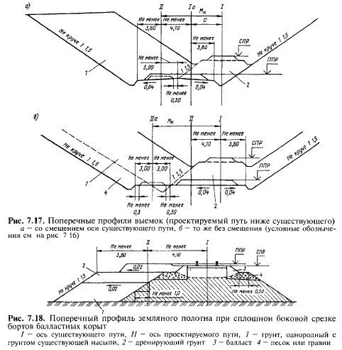 Подъемка меньше подъемки в уровне головок рельсов на разность высоты конструкции существующего и проектируемого верхнего строения пути (высоты рельса с подкладкой, шпалы и балласта под шпалой). Проектные решения, которые принимаются в случаях, когда проектируемый путь располагается ниже существующего, иллюстрируются поперечными профилями выемок. На рис 7 17,о приведен поперечный профиль выемки по типу профилей рассмотренной выше третьей группы а), а на рис. 7.17,5 — по типу профилей третьей группы б). Земляное полотно вторых путей в сложных инженерно-геологических условиях и на больных участках существующего пути следует проектировать с учетом оздоровительных мероприятий по лечению существующего земляного полотна. Например, балластные корыта можно устранить сплошной боковой срезкой их бортов (рис 7 18) Пристройка земляного полотна под второй путь до отметки ниже боковой срезки на 0,15—0,20 м проектируется грунтами, однородными с грунтами существующего земляного полотна, а выше этого уровня — только хорошо дренирующими грунтами (см рис. 7.18).