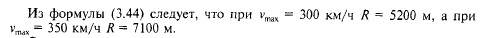 С учетом в перспективе максимальной скорости движения поездов на высокоскоростных магистралях на уровне 350 км/ч, а также с учетом взаимодействия экипажа и пути в кривых, нормами проектирования ВСМ установлено значение радиуса кривых равное 7000 м. В трудных условиях при соответствующем техникоэкономическом обосновании предусмотрена возможность уменьшения радиуса кривых, но не менее чем до 4000 м (при этом радиусе vmax = 260 км/ч). Длины переходных кривых определяют в соответствии с зависимостями (3.6) и (3.7) (см. п. 3.3). Значение вертикальной составляющей скорости подъема колеса на возвышение наружного рельса в пределах переходной кривой dh/dt принимают равным 42 мм/с (0,15 км/ч). При этом длины переходных кривых /, м, рассчитывают по формуле