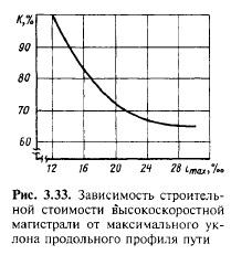 При скорости v = 225 км/ч уклон отвода возвышения наружного рельса [см. формулу (3.7)] / = 0,15/225 = 0,00067 Такой уклон отвода возвышения принят нормами проектирования в качестве наибольшего на высокоскоростных магистралях. Поэтому при максимальной скорости менее 225 км/ч длина переходной кривой [см. формулу (3.6)]. Прямые вставки между смежными кривыми на высокоскоростных магистралях устраивают возможно большей длины. При максимальных 3015350 км/ч длину прямой вставки между начальными точками переходных кривых принимают не менее 800 м, а при vmax = = 200i300 км/ч — не менее 600 м. Только в трудных условиях при соответствующем техникоэкономическом обосновании допускается уменьшение прямой вставки при скоростях 301—350 км/ч до 700 м. Расстояние между осями главных путей на перегонах и на станциях принято равным 4500 мм. Продольный профиль высокоскоростных магистралей. При обосновании наибольшего уклона продольного профиля высокоскоростных магистралей было проведено экспериментальное проектирование участка трассы ВСМ Центр — Юг протяженностью около 700 км, при котором варьировалась крутизна наибольшего уклона продольного профиля пути imM от 12 до 30 %о. Использование более крутого уклона профиля привело к соответствующему уменьшению объема земляных работ и водопропускных сооружений (мостов и труб), в результате чего строительная стоимость магистрали К сократилась (рис. 3.33), однако увеличение уклона продольного профиля свыше 22—24 %о уже не дало ощутимого удешевления строительства. В отсутствие на трассе затяжных ограничивающих уклонов эксплуатационные показатели (время хода поездов, расход электроэнергии на тягу) в вариантах более крутого уклона профиля возросли незначительно (менее чем на 1%), что является следствием указанной в п. 2.7 большой удельной мощности тяговых средств. Поэтому нормами проектирования ВСМ наибольший уклон продольного профиля пути установлен в размере 24 %о, а в особо трудных условиях при соответствующем техникоэкономическом обосновании он может быть увеличен до 35 %о (такой уклон может потребоваться лишь при пересечении трассой значительных высотных препятствий).
