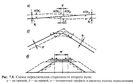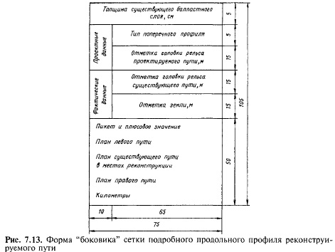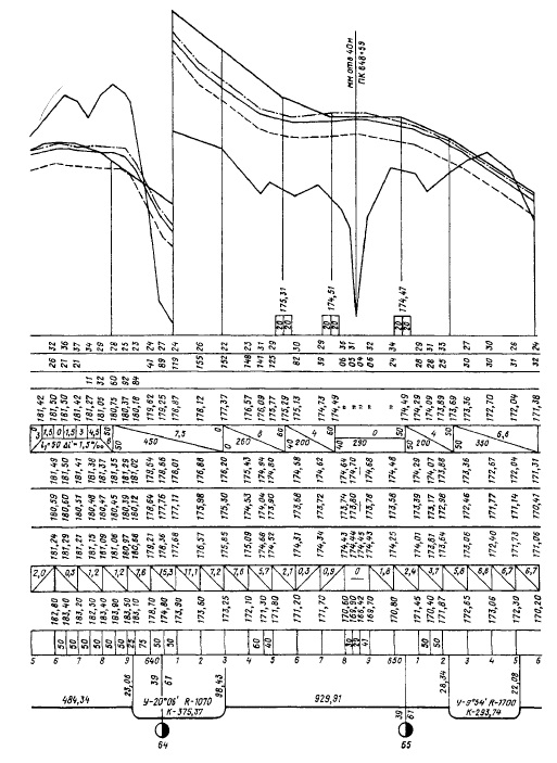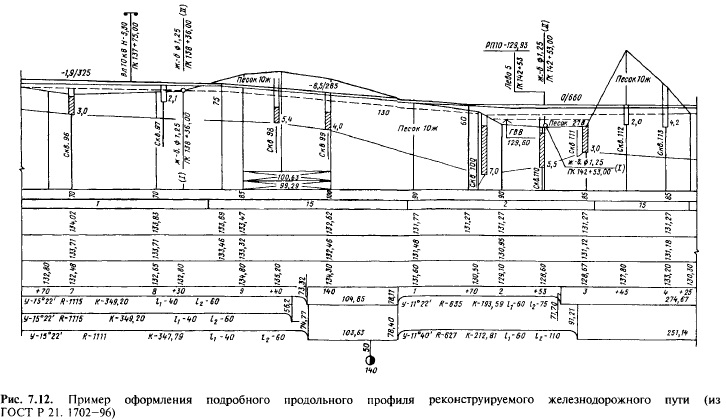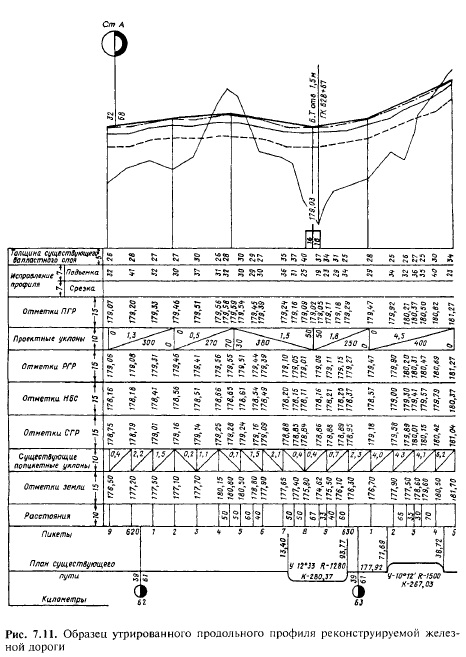 соблюдая условие ПГР > РГР, потребуется либо уширять земляное полотно с обеих сторон от оси существующего пути, либо с целью сохранения откоса, противоположного пристраиваемому дополнительному пути, смещать ось существующего пути в сторону дополнительного пути (см. п. 7.6). Чтобы избежать больших подъемок пути на значительном протяжении, иногда целесообразно принять такой вариант проектной линии, по которому на данном участке выполняется меньшая подъемка, но на соседнем участке проектная линия проходит ниже линии РГР. В этом случае после срезки всего существующего балластного слоя нужно срезать на толщину ДЛср земляное полотно и вновь уложить балласт. Эффективность таких решений должна быть обоснована технико-экономическим сравнением вариантов. Поскольку срезка земляного полотна требует достаточно продолжительных “окон” в графике движения поездов, то такие решения, как правило, оправдываются лишь при незначительном протяжении срезки и когда при этом значительно уменьшаются объемы работ по подъемкам пути на смежных участках. Срезка земляного полотна целесообразна, если она сочетается с оздоровительными мероприятиями по земляному полотну, например со срезкой балластных корыт и лож. На средних и больших мостах отметки подошвы рельса должны быть сохранены. Поэтому на подходах к этим мостам иногда необходимо срезать земляное полотно. На малых мостах с балластным слоем небольшие подъемки (до 0,10—0,15 м) могут быть допущены путем увеличения толщины балласта, а на малых мостах без балластного слоя примерно на ту же высоту можно поднять пролетное строение. На рис. 7.11 показан образец утрированного продольного профиля при реконструкции особогрузонапряженной линии. Тонкой сплошной линией изображен профиль СГР, штриховой линией - профиль НБС, другой тонкой сплошной линией — профиль земли, штрих-пунктиром — линия РГР и толстой сплошной — проектная линия (ПГР). На переломах проектной линии при алгебраической разности уклонов более 2,8 %о (см. п. 3.6) учтено влияние на проектные отметки сопрягающей кривой в вертикальной плоскости. На рис. 7.12 приведен пример оформления подробного продольного профиля реконструируемого железнодорожного пути, а на рис. 7.13 показана форма боковика сетки этого профиля. ![]() ![]() ![]() ![]() Изыскания и проектирование железных дорог. — М.: ИКЦ «Академкнига», 2003. - 288 с.. |